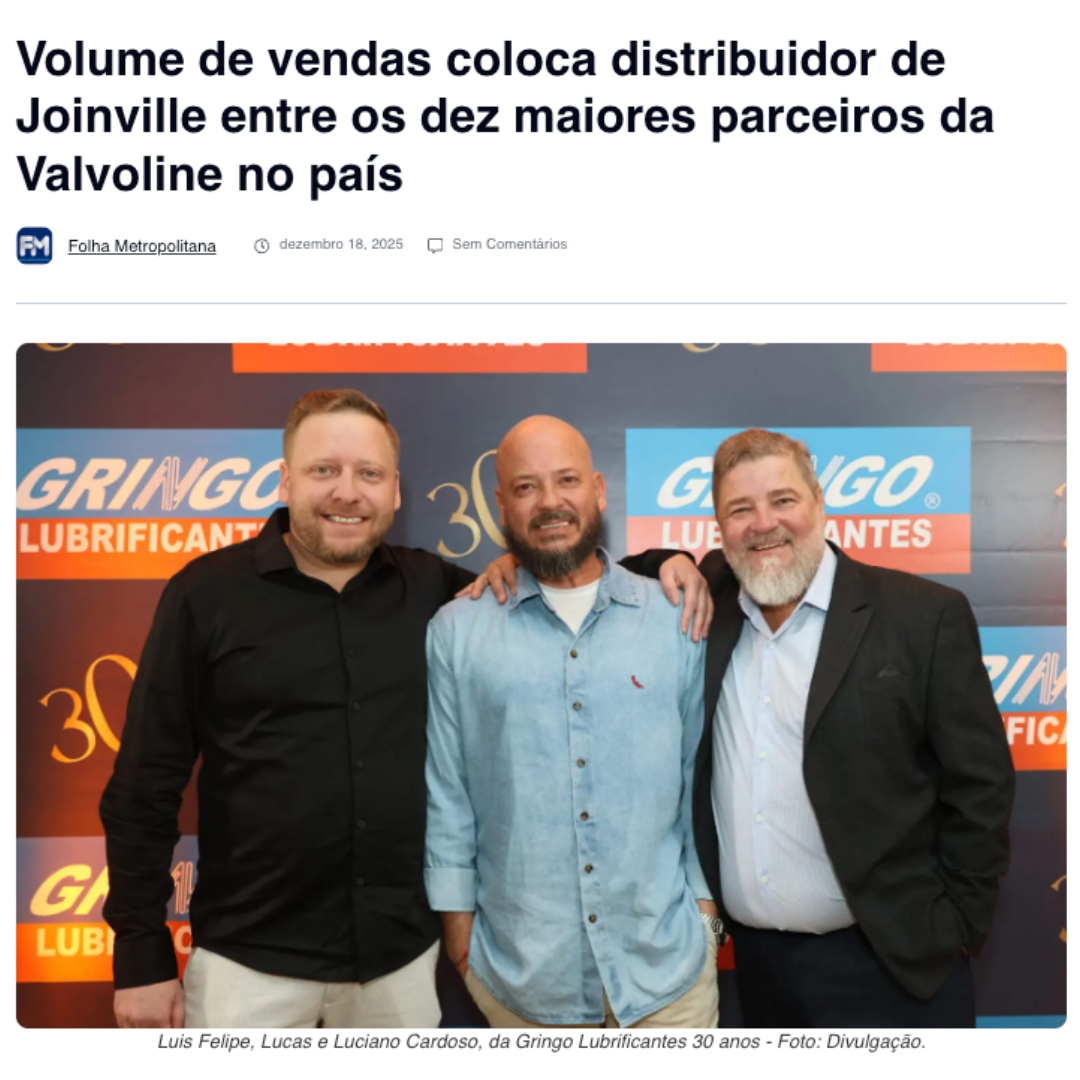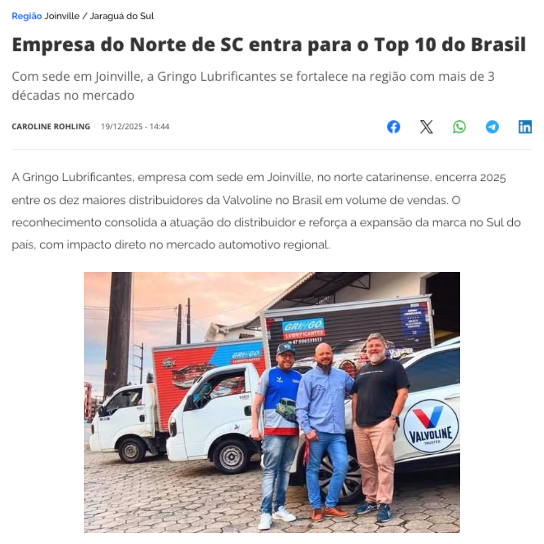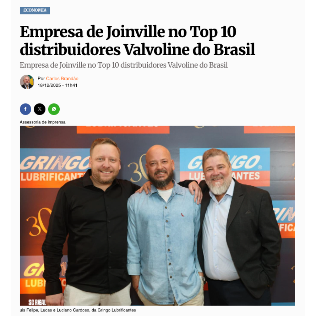 Distribuidor Valvoline no Norte de Santa Catarina - A Gringo Lubrificantes atua no atacado de insumos automotivos e industriais, com qualidade, variedade e atendimento especializado. São 32 anos de mercado, sendo distribuidora autorizada Valvoline em Joinville e região.